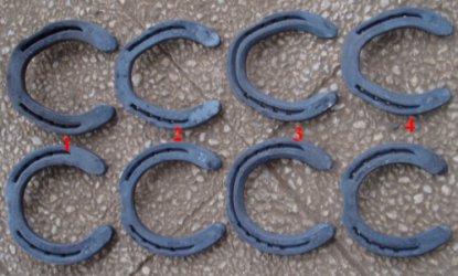 1 : fers taille n°4 : notre Boulonnaise « Jortance » 2 : fers taille n°2 : notre Palomino « Jade » 3 : fers taille n°1 : notre Trotteur « Iraty » 4 : fers taille n°00 : notre Selle française « Caly » et nos 2 Espagnoles « Indy et Joyce »